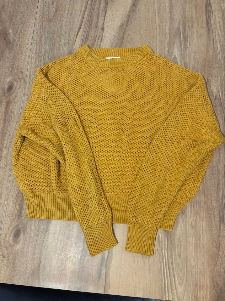 Sarı renkli, uzun kollu, yuvarlak yakalı, örgü dokulu, rahat kesim kadın kazak. Günlük kullanıma uygun, sade ve konforlu.s beden. az kullanıldı.