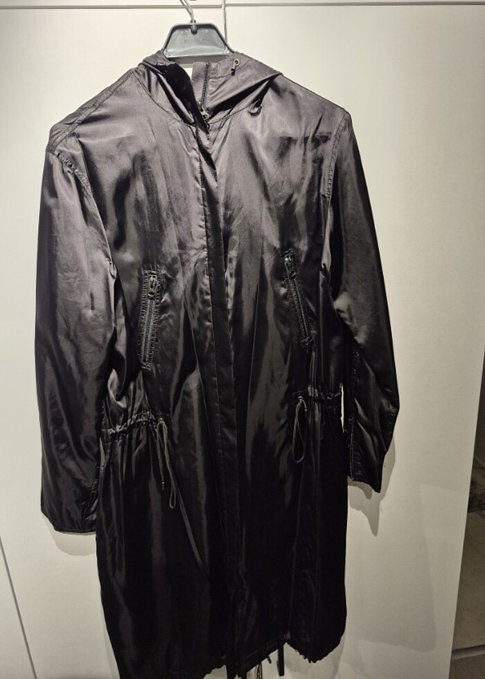 mangodan aldigim satin ceket satiliktir. sadece birkac kere giyilmistir. hem gunluk kiyafetlerle hem de afiyet kiyafetlerle kullanabilirsiniz. kapusonlu, fermuarli ve beli buzgulu bir modeldir.
