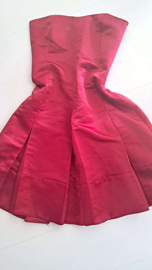 Bordo ve kırmızı arası bir renkte, straplez ve midi boyda Saten, parlak kumaştan üretilmiş, belden vücuda oturan kesimi ve pile detayları ile vintage ve avangart bir tarz sunar. Kolsuz ve düğün için uygundur.