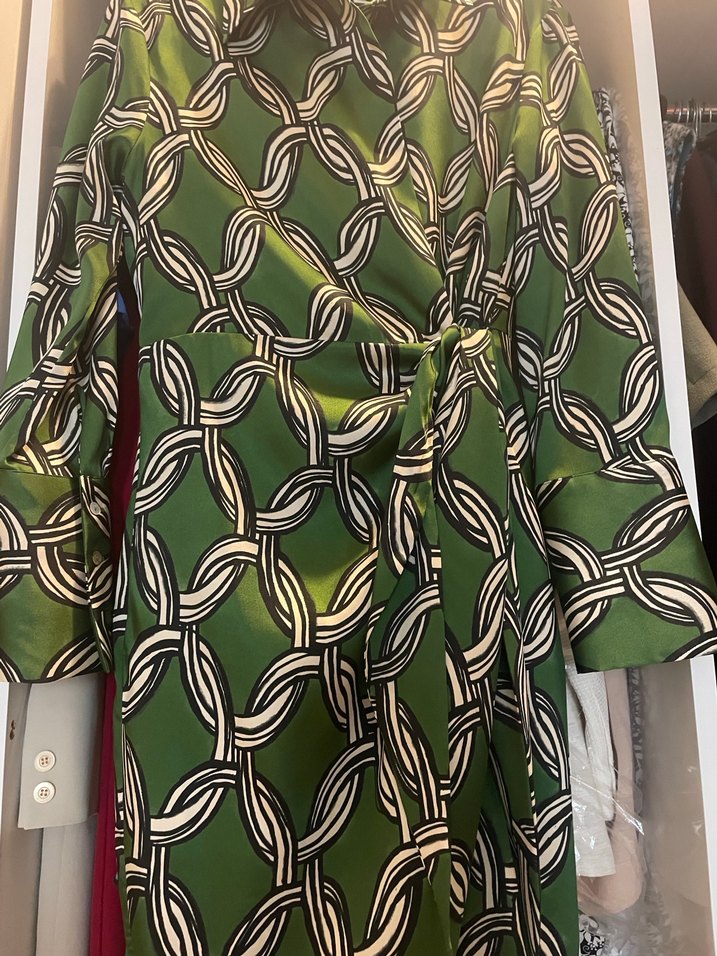 Zincir detaylı, parlak yeşil desenli kumaştan yapılmış, gömlek yaka ve anvelop kesim kadın elbise. Hiç giyilmedi, kurumsal iş hayatına ara verdiğim için satışta. S ve M beden uyumludur. Seçeceğiniz ayakkabı ile her ortama uyum sağlayabilirsiniz.