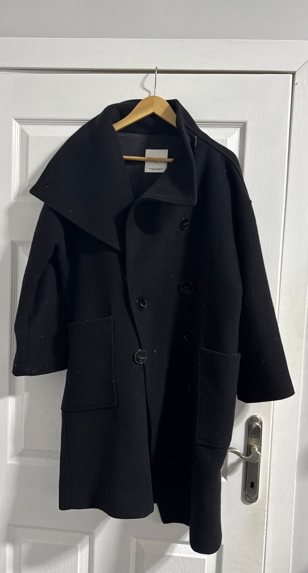 Siyah uzun kaban, geniş yakalı ve çift düğmeli tasarıma sahiptir. Büyük ön cepleri ve yumuşak, sıcak dokusu bulunur. ( biraz tüylenme mevcut jilet vb ile geçecegini düsünüyorum uyguna koyuyorum)