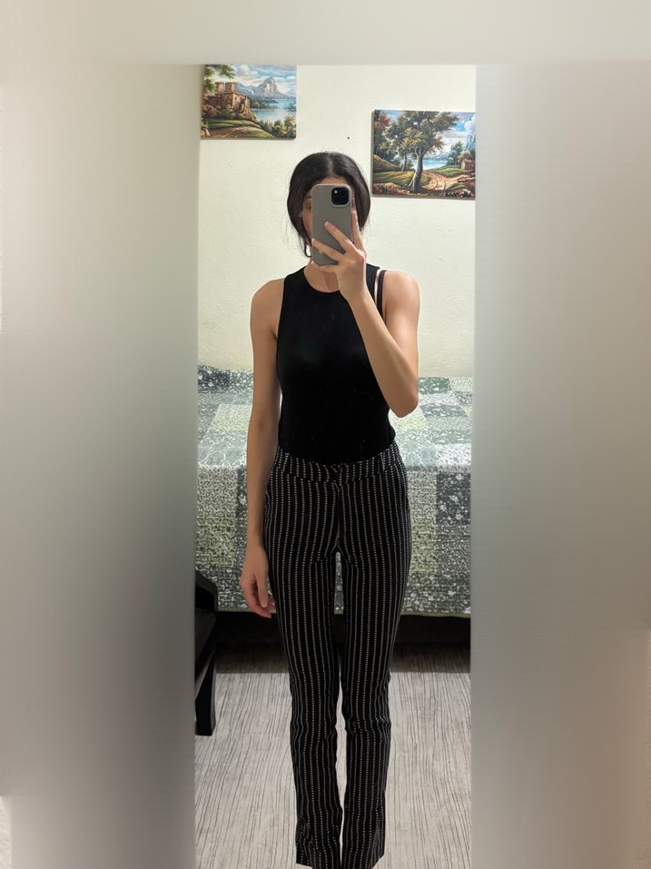 Siyah çizgili cigarette pantolon. Ofis ve günlük şıklık için ideal, rahat ve minimal tarz sunar. 32 bedendir