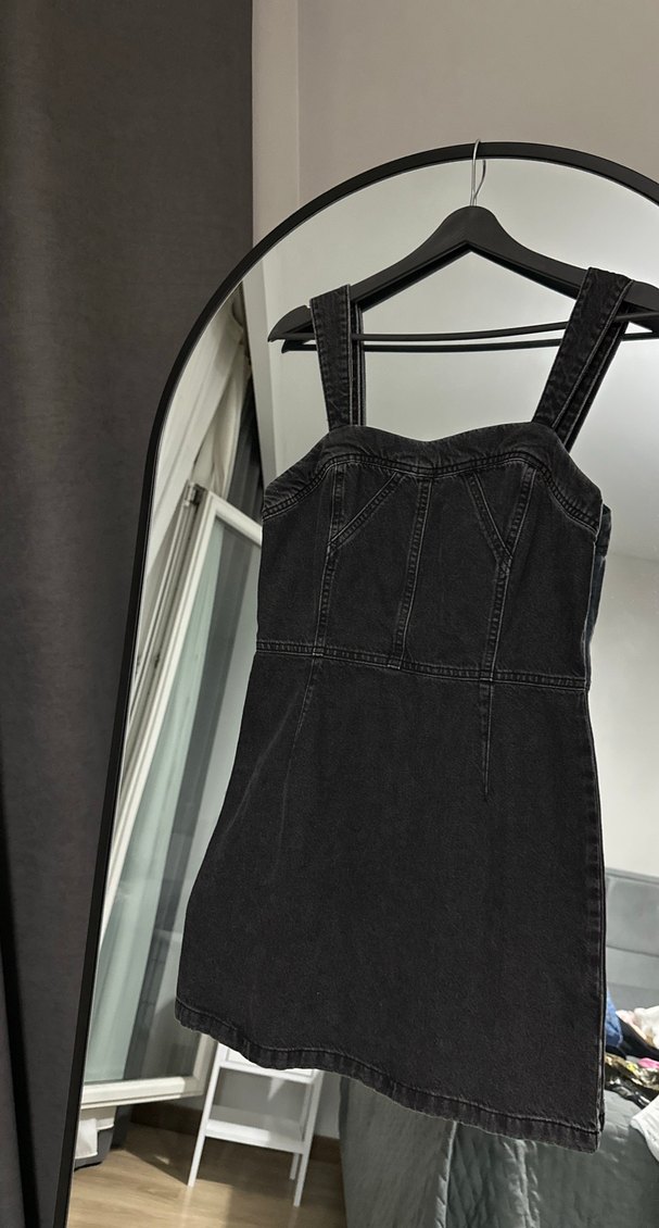 Siyah denim kumaştan, askılı kısa elbise. Straplez yaka ve dar kesim ile günlük sokak stiline uygun. S bedendir