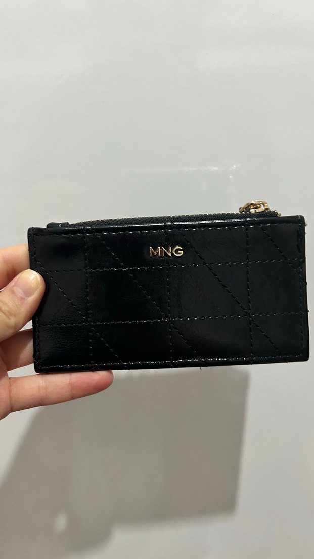MNG marka siyah deri cüzdan, fermuarlı kapama ve hafif yılan derisi dokusuna sahip, günlük kullanım için minimal sokak stiliyle uyumlu.