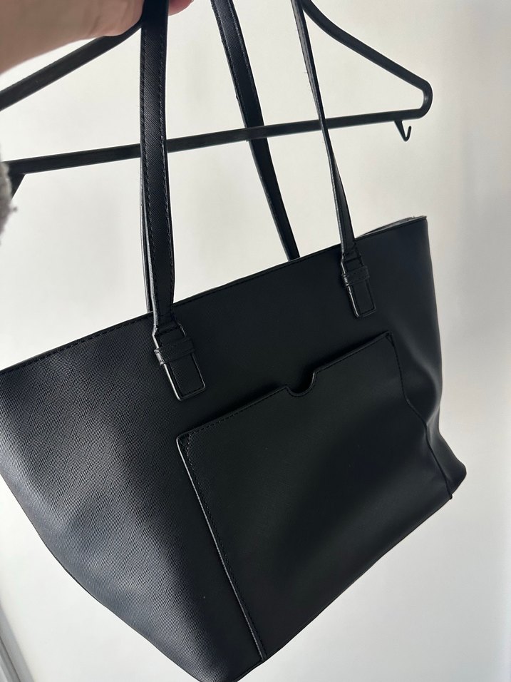 Siyah deri, tokalı kadın omuz çantası, minimalist tarzda ve desensiz yüzeye sahip, günlük kullanım için uygun. Saplarında soyulmalar vardır.