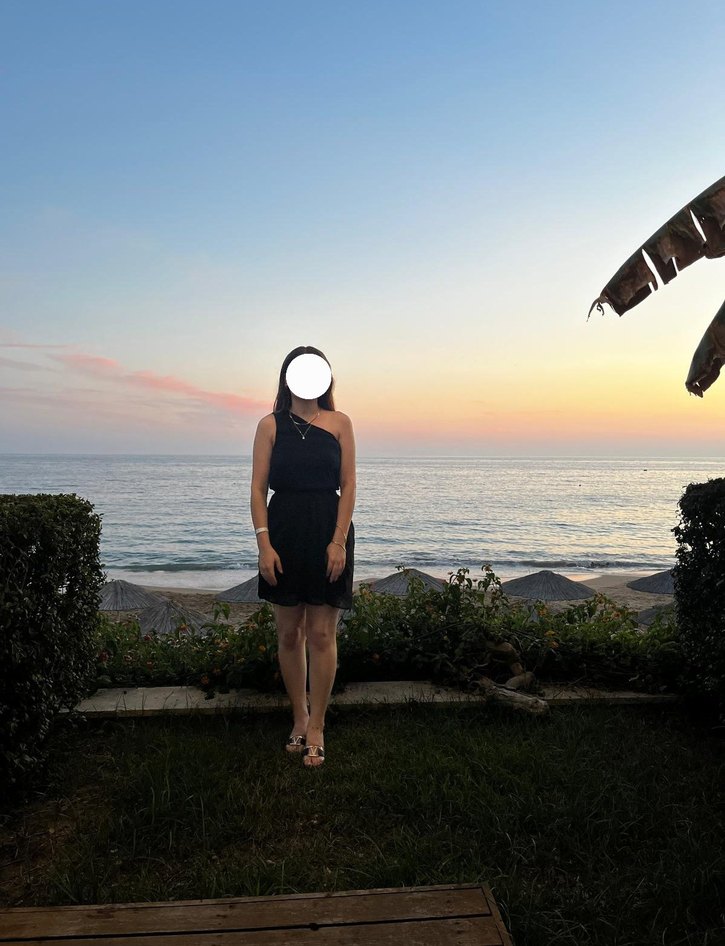 Siyah, drapeli ve askılı detaylara sahip mini, tek omuz elbise. Rahat sentetik kumaştan, plaj için uygun.