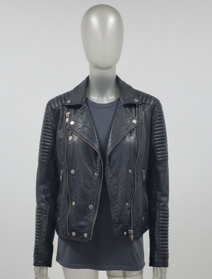 Mango marka, siyah deri, biker tarzı, oturtmalı kesim, kayış detaylı, çıtçıtlı ve fermuarlı, notched yaka, uzun kollu kadın ceketi.