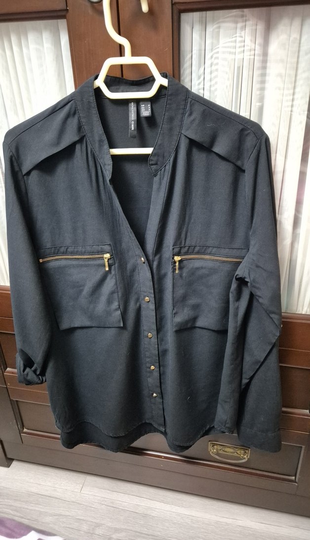 Siyah düğmeli, notched lapel yakalı, cep fermuarlı, uzun kollu, bol kesim kadın gömleği. Ofis kullanımı için uygundur.