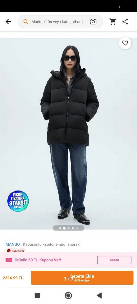 MANGO'nun siyah kapüşonlu, kapitone midi anorak ceketidir. Uzun kollu, yüksek yakalı ve kemerli bel detayına sahiptir. Günlük kullanıma uygundur.