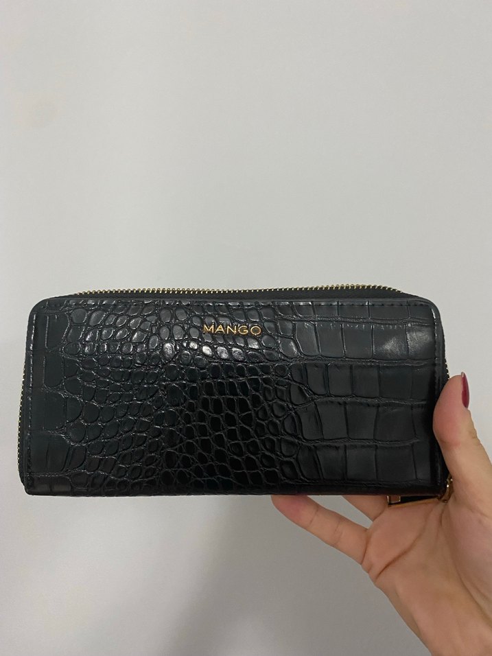 Mango marka siyah deri, kroko desenli, fermuarlı kadın cüzdanı, klasik şıklık ve sokak stilini bir araya getirir.