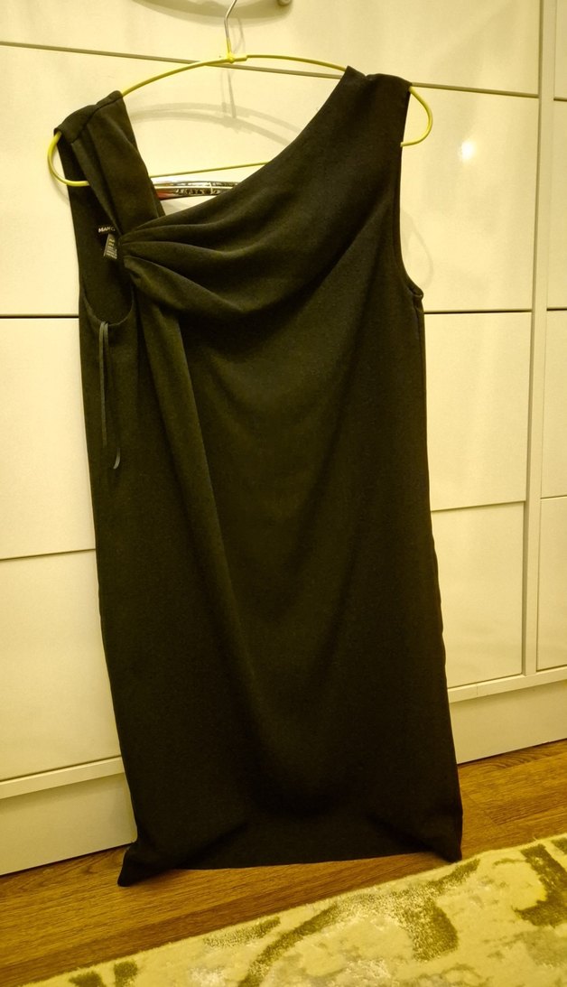 Dökümlü kayık yaka ve kolsuz tasarıma sahip siyah elbise. Rahatlık için ipeksi kumaştan üretilmiştir. Minimalist gotik stil ofis için uygundur. Bir kac kez giyilmistir. Leke sökük yoktur