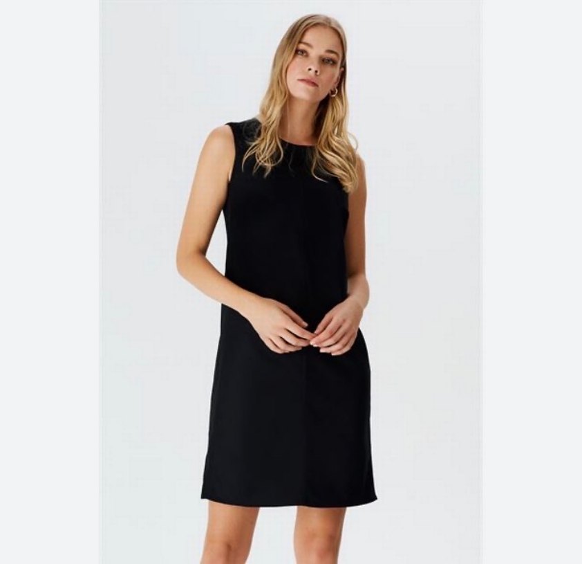 Yeni kalıbı biraz dar Siyah, kolsuz, midi kalem elbise, rahat kesimi ve ipeksi dokusuyla ofis için sade ve şık bir seçenek sunar.