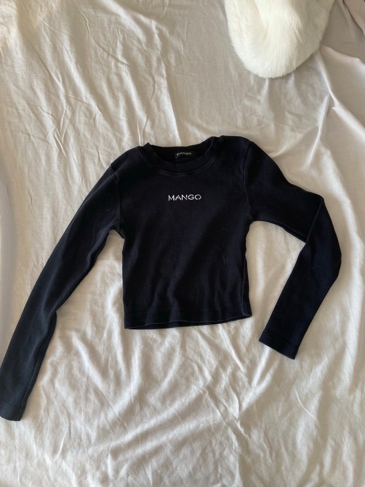 Siyah, pamuklu, uzun kollu ve kruvaze yaka fitted crop top. Minimalist 'MANGO' baskısı ile günlük kullanıma uygun.