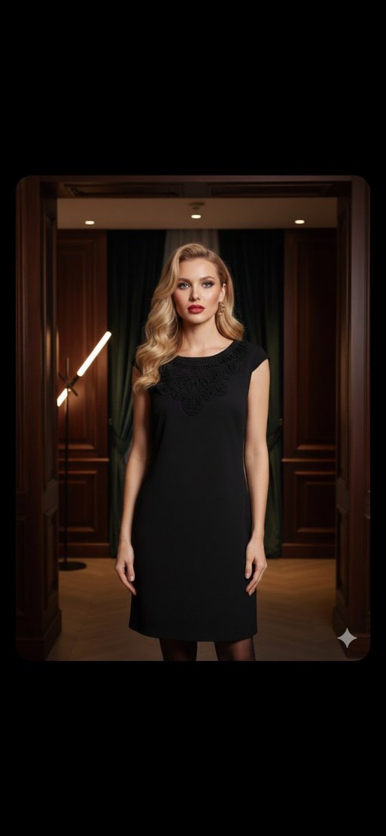 Siyah renkte, V yakalı ve kolsuz midi boyda, klasik ve rahat bir kesime sahip kadın elbisesi. Ofis için uygun, zarif bir şıklık sunar. Boy ,82 iki koltuk arası 37 cm VİTRİN görseli temsilidir içi astarlidir