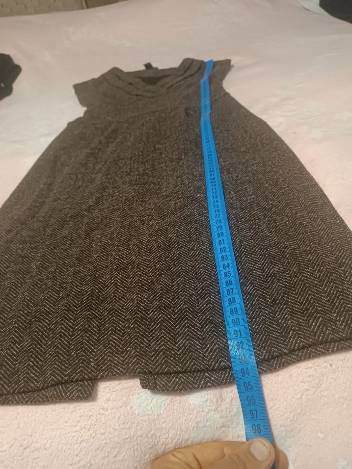 V yaka, kolsuz ve fitted kesime sahip bu midi elbise, yumuşak yün triko kumaştan yapılmıştır. Kahverengi-gri tonlarında, günlük kullanıma uygundur. ölçüleri resme ekledim hoş ve şık bir elbisedir