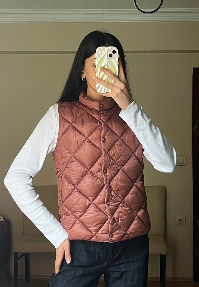 Düğmeli, yüksek yakalı ve kahverengi tonlarında, yumuşak sentetik kumaştan yapılmış, günlük kullanıma uygun, sokak tarzı bir yelek.