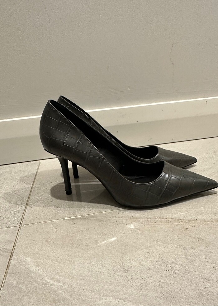 Gri, antresit rengindedir. Deridir. Alti temiz, iki kere ic mekanda giyildi. Ayak dekoltesi guzeldir