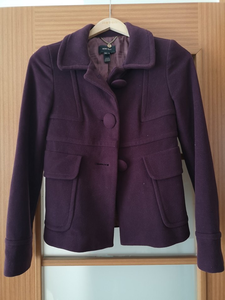 Mor renkte, yumuşak ve sıcak kumaştan kadın kaban. Klasik yakalı, düğmeli kapamalı ve cep detaylı, iyi durumda. S beden