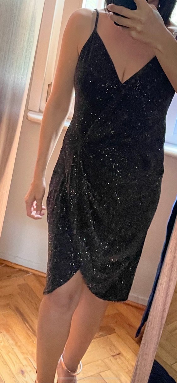 Siyah, drapeli ve V yaka tasarıma sahip, askılı kollu, vücuda oturan midi abiye simli ve esnek kumaş.hiçbir defosu yok ,bir kez giyildi,tadilat yapılmadı,göğüs dekoltesi istenilen şekilde kullanılabilir (drape olduğu için)