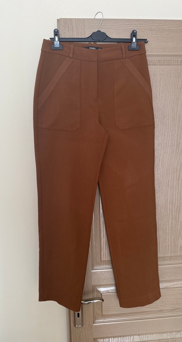 Yüksek bel, midi boy, regular fit kadın pantolon. Sentetik kumaştan, desensiz ve ofis için uygun, zahmetsiz şıklık sunar.