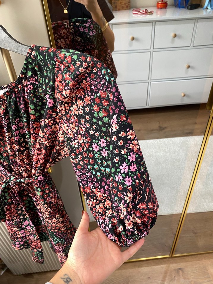 Yumuşak sentetik kumaştan, çiçek desenli uzun, bol kesim bohem . Fırfırlı detaylı, kayık yaka