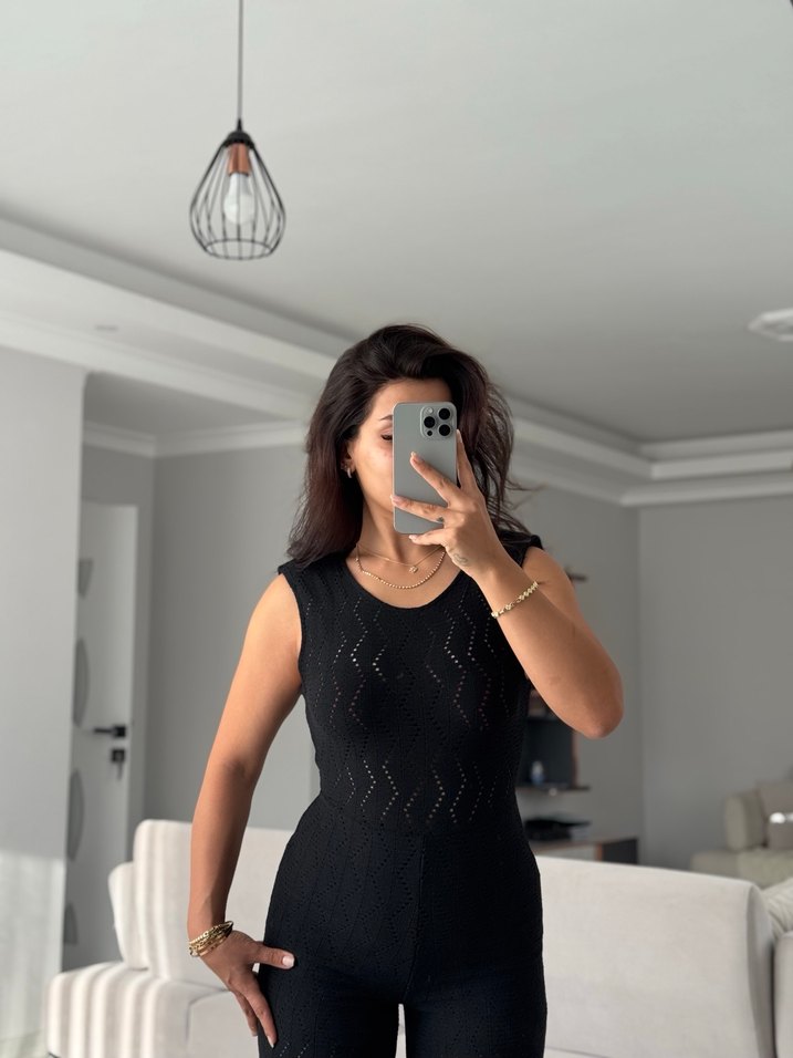 Siyah, kolsuz, yuvarlak yaka, örgü kumaştan yapılmış transparan detaylı, MANGO MARKA , vücuda oturan minimalist goth tulum. S-m uyumlu