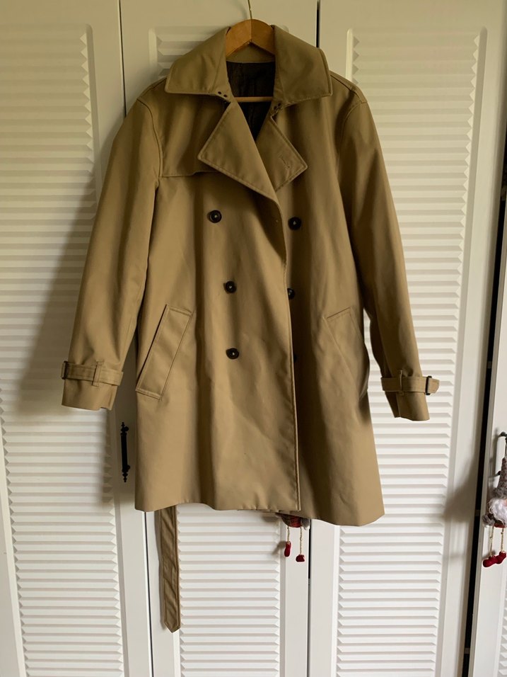 Bej midi uzunlukta, kuşaklı ve rahat kesimli trençkot. Sentetik kumaştan, yakası çıtçıtlı ve desen içermeyen sade tasarım. Günlük kullanım için uygun.