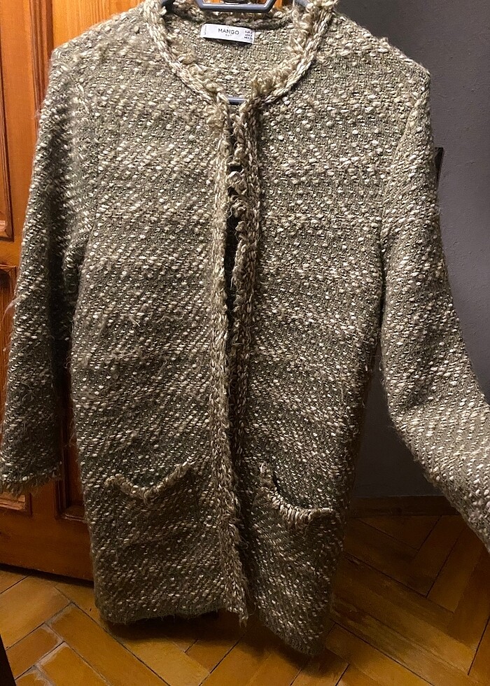 Çok eski sezon. Dolayısıyla hafif tüylenmeleri var. İkinci fotoğrafta klips gibi bişeyi var sadece üstten kapanıyor. Çok tatlı karışık bir yeşil bir tonu var