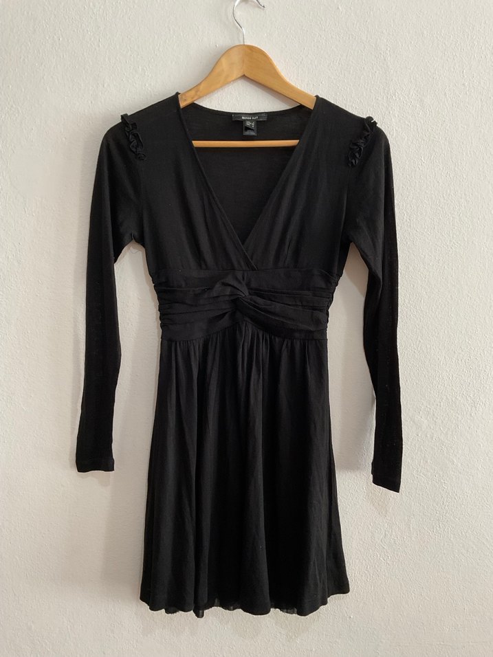 Mango marka, uzun kollu, V yakalı, önü düğüm detaylı siyah elbise, gotik ve bohem tarzda, şık bir elbisedir. S bedendir.