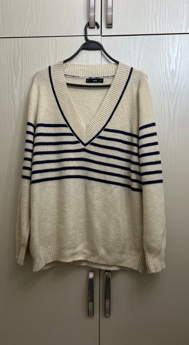 Mango V yaka ve uzun kollu, gevşek kesim kadın kazak. Rahat örgü kumaştan, beyaz ve lacivert çizgili desene sahip, günlük sokak stili için uygundur.