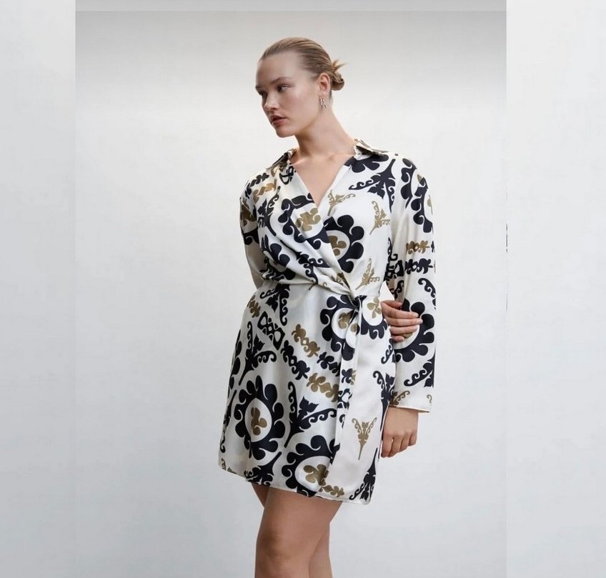 V yaka, uzun kollu, bol kesim mini elbise, ipeksi kumaştan ve kemerli. Cesur desenleriyle günlük kullanıma uygun.