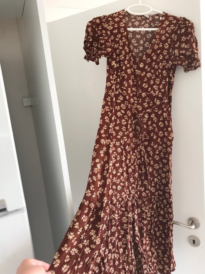 Bohem tarzda, V yakalı, bol kesim uzun kahverengi elbise. Yumuşak pamuk kumaş, çiçekli desen ve kısa balon kollu, günlük kullanım için uygundur.