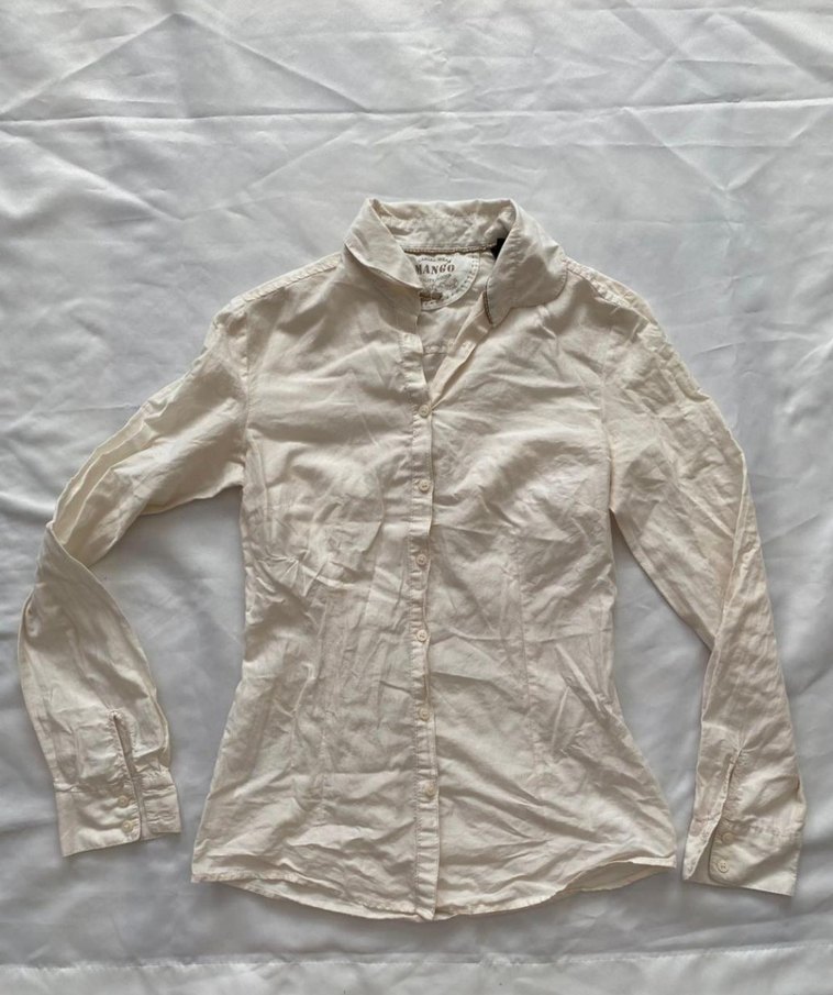 Kırık beyaz rengindedir. Kumaşı yumuşacık. %14 ipek, %64 pamuktur. Son fotoğrafta görüldüğü gibi minik lekesi var ama iliklenince arkada kalıyor.