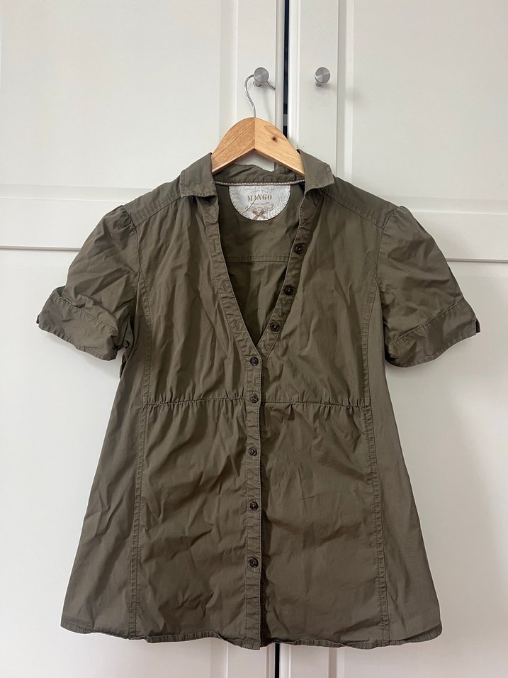 Mango Vintage Kadın Haki Keten Kısa Kollu Gömlek