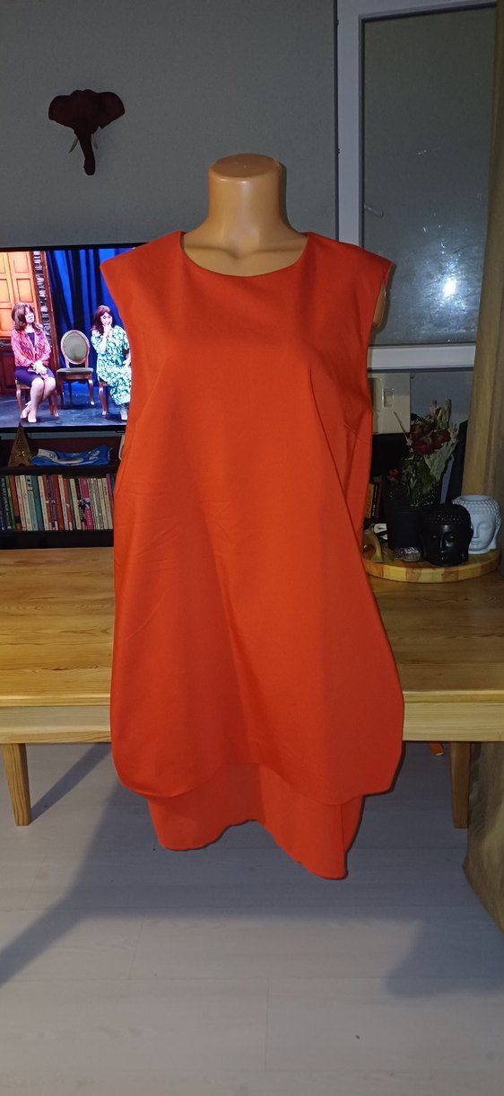 Kırmızı parlak kumaştan, salaş kesim ve drapeli, kolsuz tunik. Midi boyda, yuvarlak yakalı, günlük kullanıma uygun.