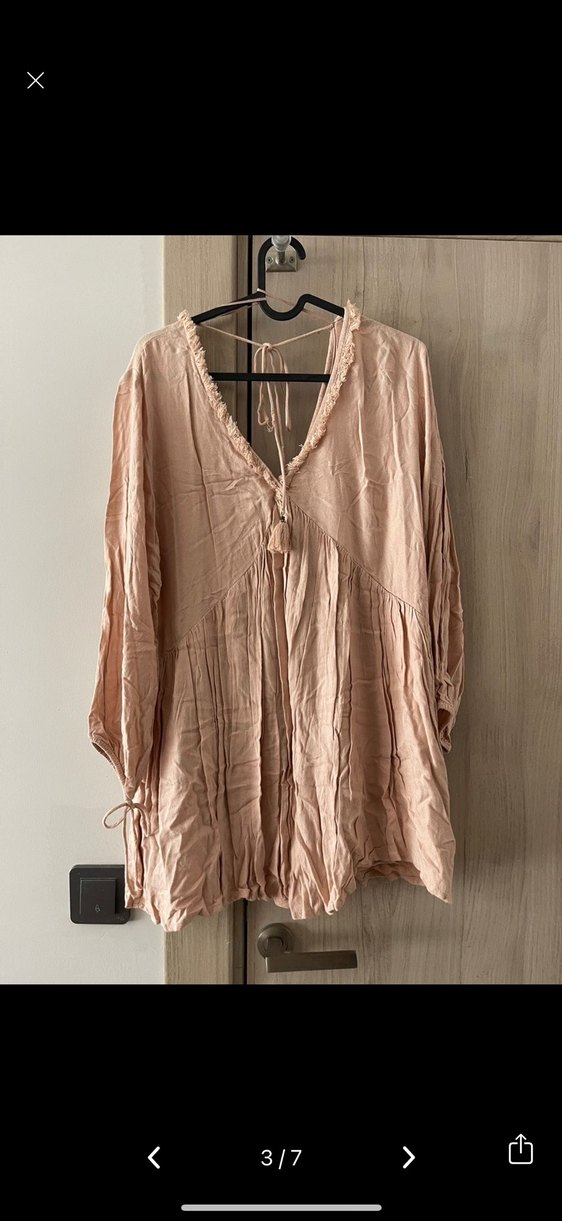 Bej renkli, keten kumaştan, bol kesim ve pliseli detaylara sahip mini elbise . Minimalist bohem tarzıyla günlük kullanıma uygundur.