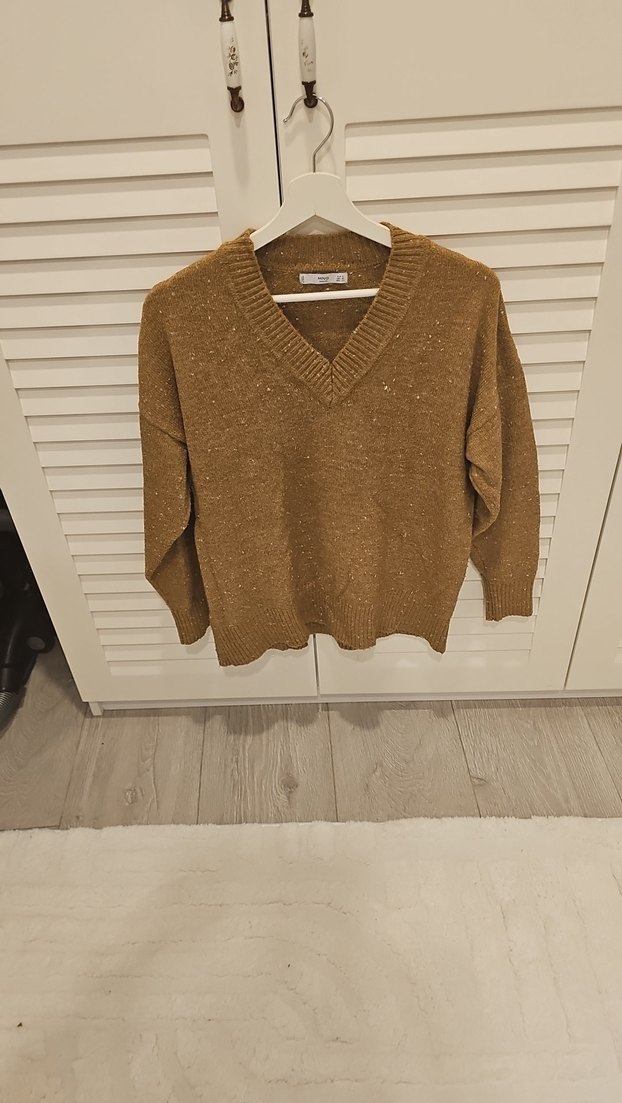 %71 akrilik tertemiz V yaka, uzun kollu, kahverengi örgü kazak. Rahat kesimi, normal midi boyu ve desensiz tasarımıyla günlük kullanıma uygundur.