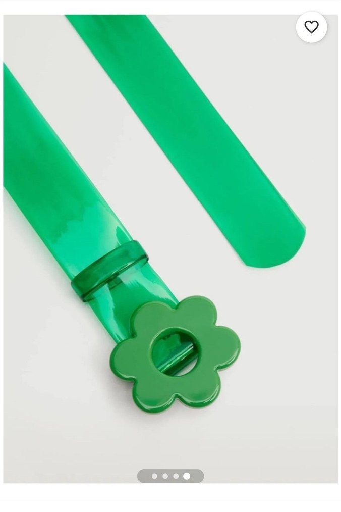 Yeşil renkli, çiçek şeklinde tokalı, parlak plastikten yapılmış kadın kemeri. Minimalist ve retro tarzlara uygundur. Hiç kullanılmamıştır.