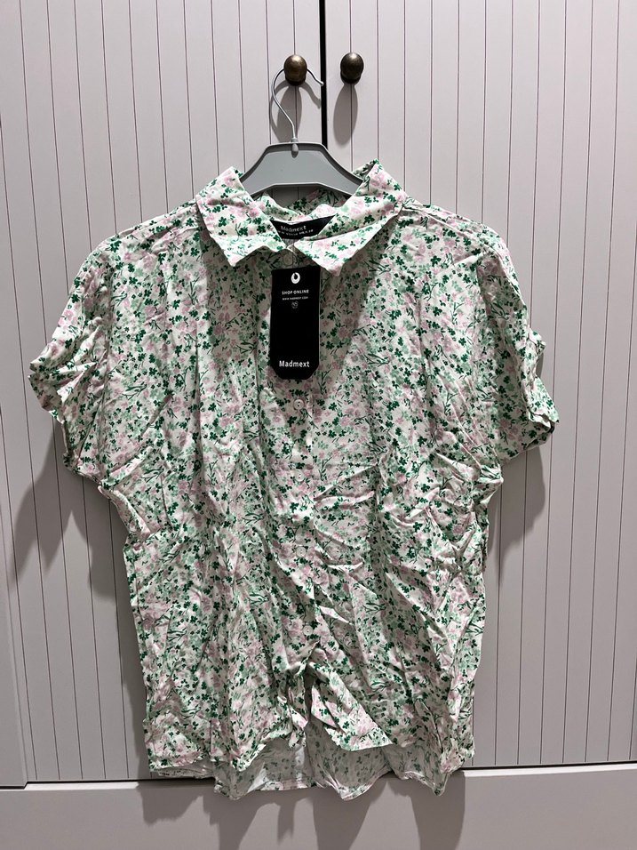 Yeşil pastel tonlarında, keten kumaştan, kısa kollu ve yakalı, düğmeli ön kısmı ve bol kesimi ile günlük dış mekan kullanıma uygun bir bluz. Kadın kısa kollu gömlek sıfıı etiketli hiç kullanılmadı ütülenince açılacaktır