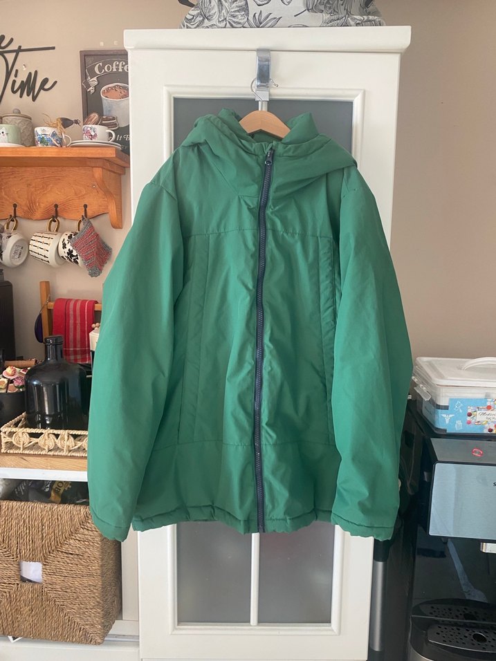 Yeşil renkte, yüksek yakalı ve fermuarlı ön kısmı olan uzun kollu erkek çocuk montudur. günlük kullanıma uygundur. Yumuşak ve sıcak tutan kumaştan yapılmıştır. Ürün mağazadan alınmıştır ve 13-14 yaş etiketlidir. Sabit kapişonlu yanlardan cepli bir modeldir. Ayrıca fermuarı boyun kısmında oldukça yüksek olduğu için atkı kullanımına gerek kalmaz sıkıca boynu kapatır ve çok kullanışlıdır. Dışı koyu yeşil içi de lacivert renktedir ve fermuarı da laciverttir. Kol manşeti ve etek uçları düzdür lastiği yoktur. Hafif aşağı doğru açılan modeldir. Sorunsuz ve temiz bir üründür. Omuzdan boyu 67 cm iki kol arası 54 cm kol evi 24 cm kol boyu 58 cm manşet genişliği 13 cm etek ucu genişliği 57 cm