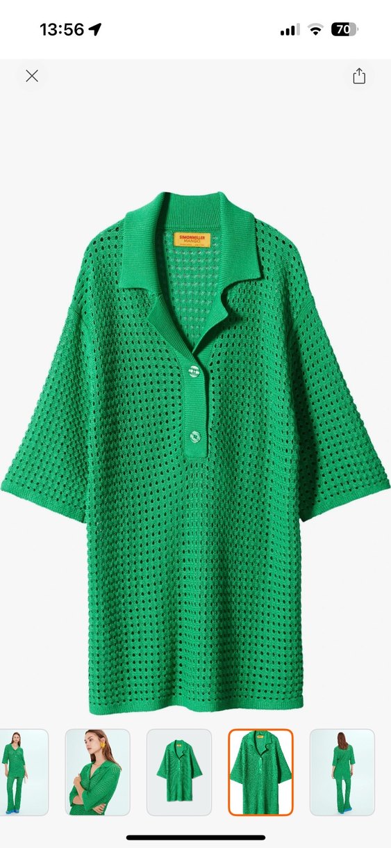 Yeşil renkli, kısa kollu, yakalı ve bol kesim örgü midi elbise. Rahat ve günlük kullanıma uygun bohem tarzda, nefes alan açık örgü kumaş.
