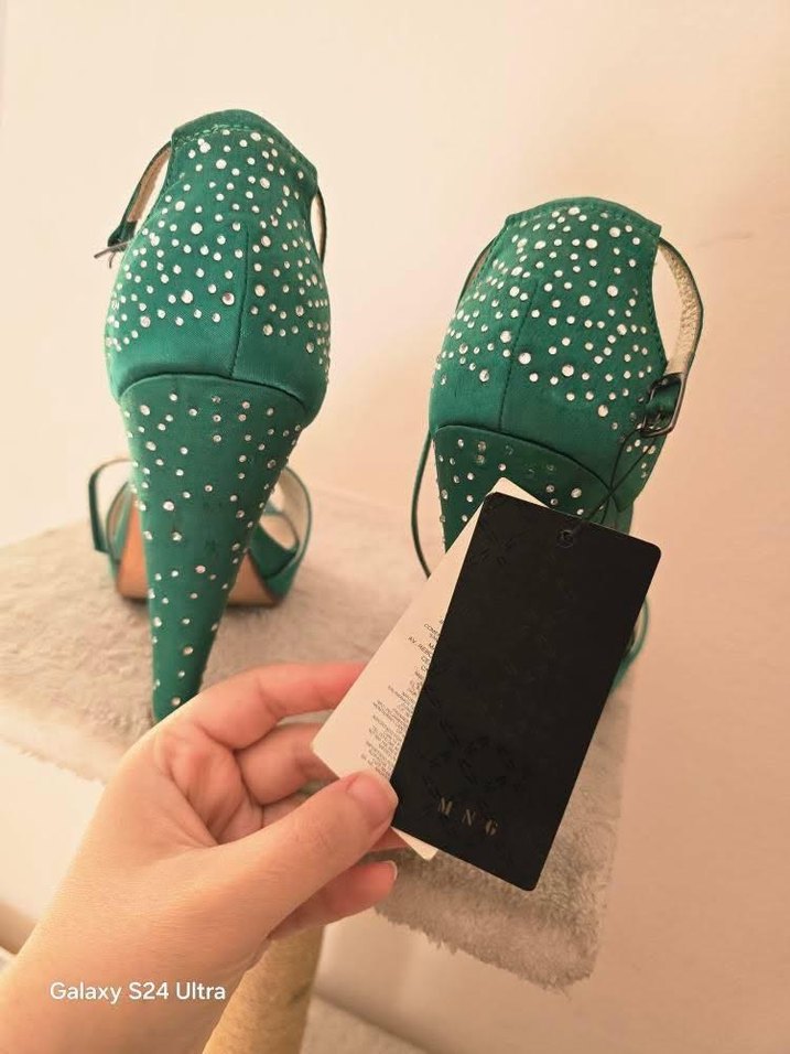 Mango Yeşil Saten Taşlı Topuklu Ayakkabı.
