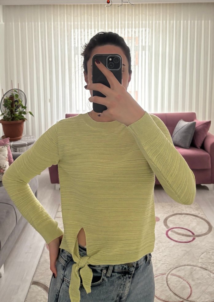 Yeşil triko kazak, uzun kollu ve bisiklet yaka tasarıma sahiptir. Normal midi boyda ve alt kısmında yırtmaç detayı bulunur, günlük kullanım için uygundur. S beden
