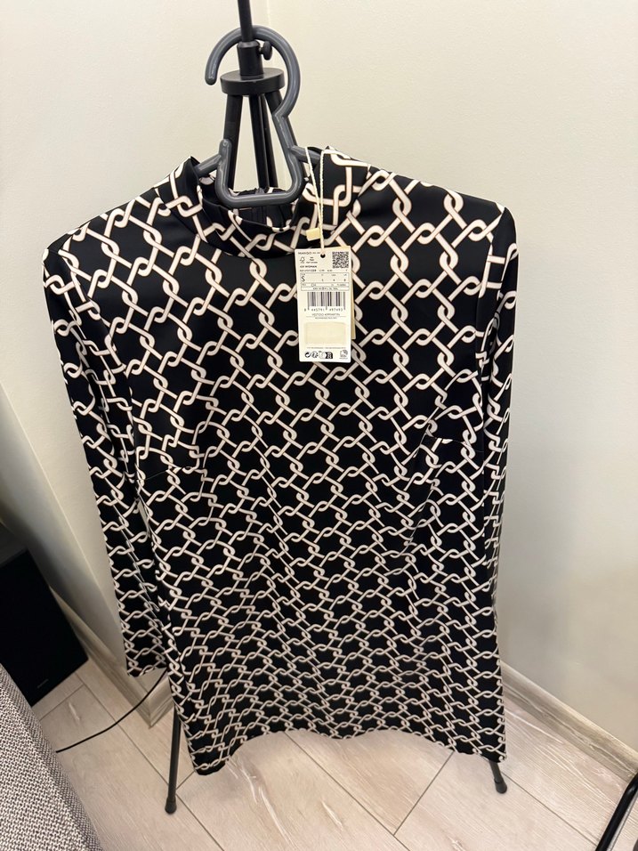 Uzun kollu, yüksek yakalı ve zincir desenli siyah mini elbise. Geniş kesim ve modern, saten kımaştır.