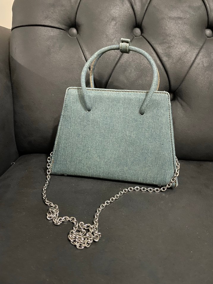 Gri denim kumaştan yapılmış, zincir detaylı ve saplı kadın çantası, günlük kullanıma uygun vintage ve çağdaş bir tarz sunar. Mangodan aldım
