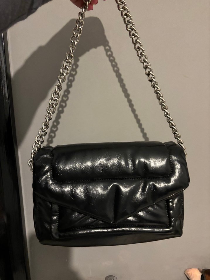 Siyah deri kadın çanta, zincir askılı ve şık biker gibi tertemiz derisi ve zinciri kararma yok