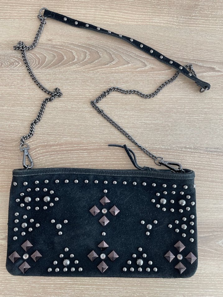 Mango Askılı Çanta, Orjinaldir, Hakiki deridir (süet), Az ve temiz kullanılmıştır, Siyah renk, Zımba detaylıdır, En: 30cm, Yükseklik: 17cm