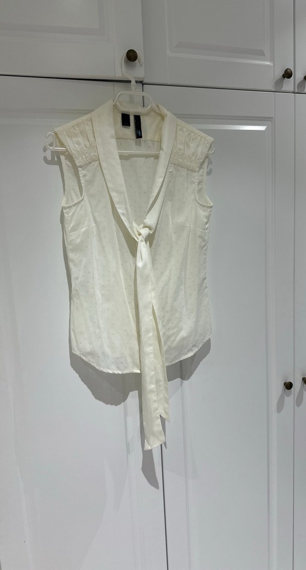 Kolsuz, beyaz, keten kumaştan yapılmış, halter yaka ve kemer detayı bulunan, vücuda oturan bluz. Ofis ve sokak stiline uygun, hafif ve rahat. Mango. Hiç giyilmedi