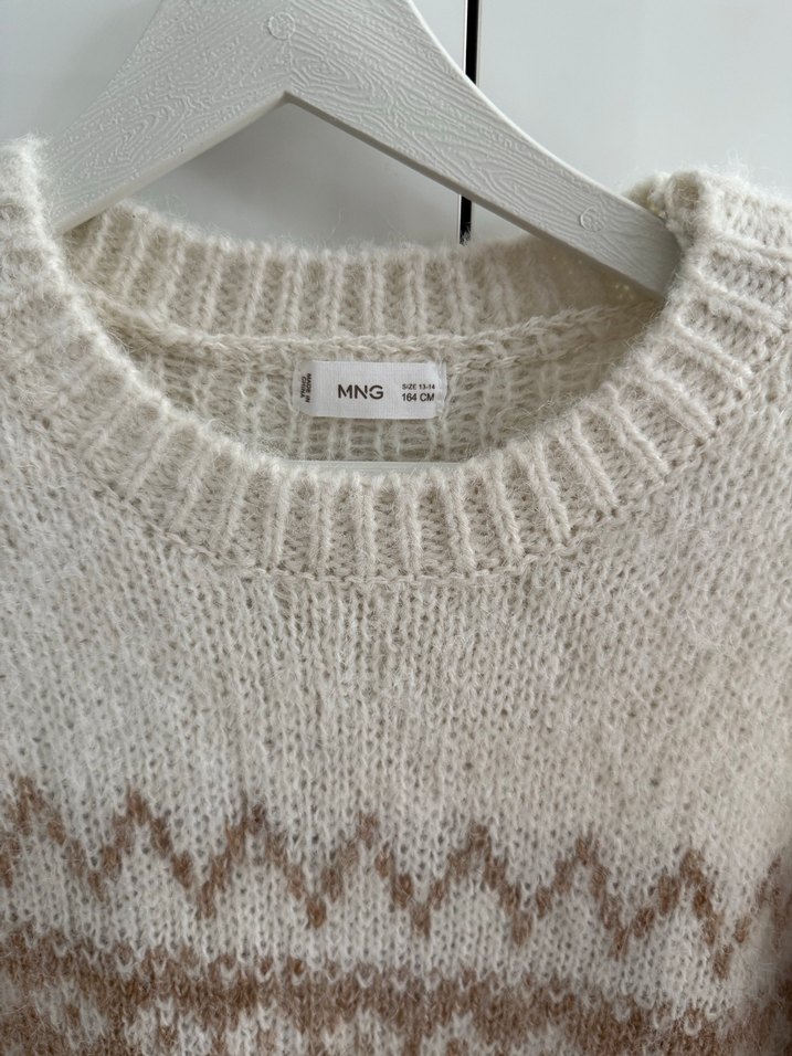 MNG marka bej renkli, bohem tarzda, gevşek kesim örgü kadın kazak. Bisiklet yaka ve uzun kollu, rahat ve desenli yapıya sahip. ✨