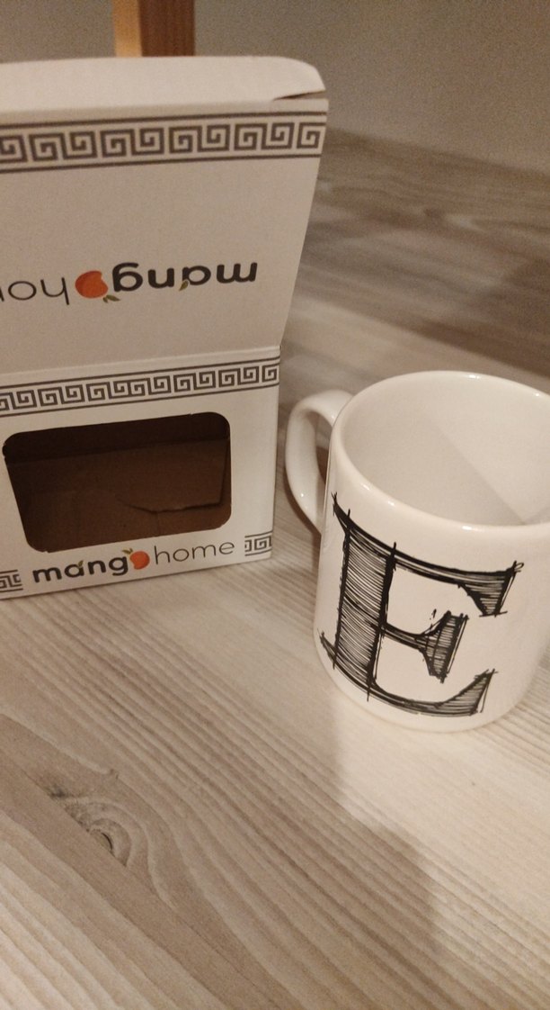 Mangohome markalı, üzerinde büyük siyah 'E' harfi bulunan beyaz seramik kupa. Kulplu ve pürüzsüz yüzeye sahiptir. ☕